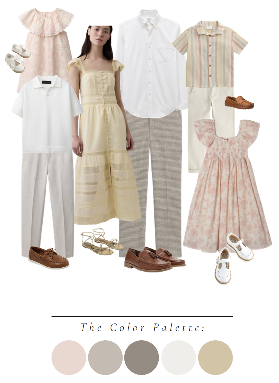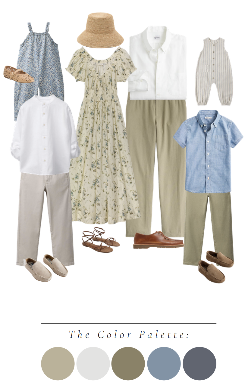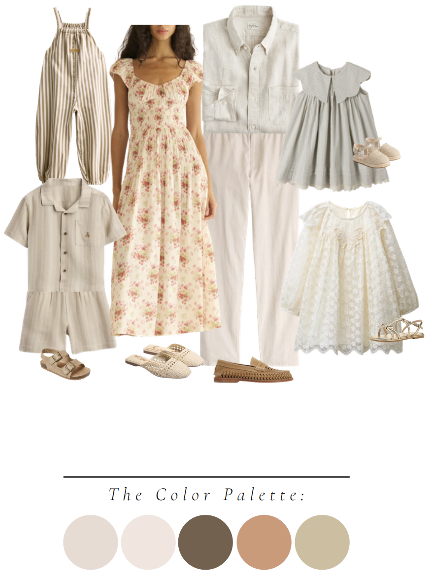 For patterns, look for light and delicate patterns, versus bold and contrasty patterns - light florals, eyelet patterns and light stripes photograph beautifully. For starters look for creams, tans, whites and light grays - add a little color with muted pinks, blues, and greens. I recommend finding the ladies outfits first. Dresses really help to capture that timeless look and I always love to recommend mamas wear dresses too. A light breeze or a simple twirl really adds beautiful motion to a photograph when you wear a dress.